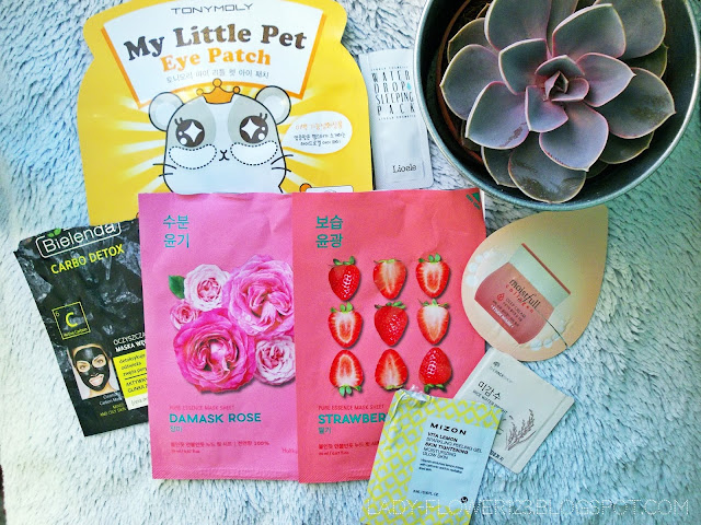 Niekonwencjonalnie zacznijmy od maseczek i próbek, a potem przejdziemy do pełnowymiarowych produktów. Na zdjęciu powyżej mamy: