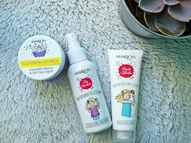 Na zakupach w Biedronce wypatrzyłam kosmetyki przeznaczone dla dzieci marki Marion. Ładne opakowania i cudowne zapachy niemalże zmusiły mnie do zakupu. Tym razem do mojego koszyka trafiły: Glutoretka do mycia o zapachu Jagodowej Muffinki, Spray ułatwiający rozczesywanie oraz krem na niesforne kosmyki.